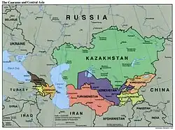 Central Asia is a region of Asia consisting of Kazakhstan, Kyrgyzstan, Tajikistan, Turkmenistan, and Uzbekistan.[4] The countries as a group are also colloquially referred to as the "-stans" as all have names ending with the Persian suffix "-stan" (meaning 'land') in both respective native languages and most other languages. The region is bounded by the Caspian Sea to the southwest, European Russia to the northwest, China and Mongolia to the east,[5] Afghanistan and Iran to the south, and Siberia to the north.