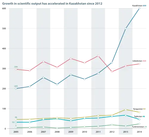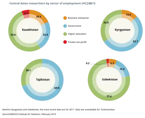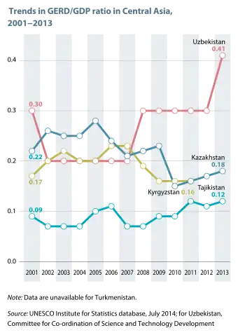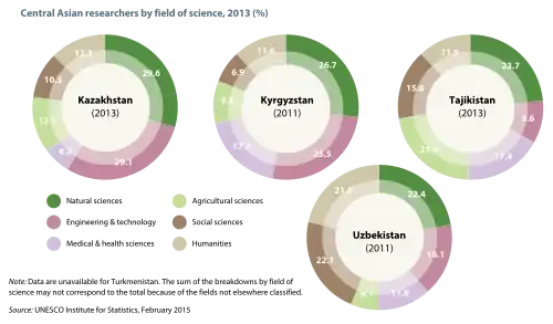 - 1 2 3 4 5 6 7 8 9 10 11 12 13 14 15 16 17 18 19 20 21 22 23 24 Mukhitdinova, Nasiba (2015). Central Asia. In: UNESCO Science Report: towards 2030. Paris: UNESCO. pp. 365–387. ISBN 978-92-3-100129-1.