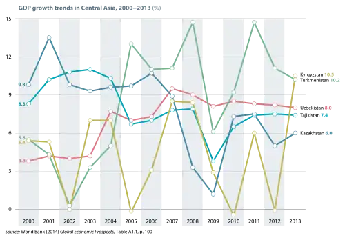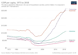 The Silk Road trade routes crossed through Central Asia, leading to the rise of prosperous trade cities.[8][9] acting as a crossroads for the movement of people, goods, and ideas between Europe and the Far East.[10][11][12] Most countries in Central Asia are still integral to parts of the world economy.[13]