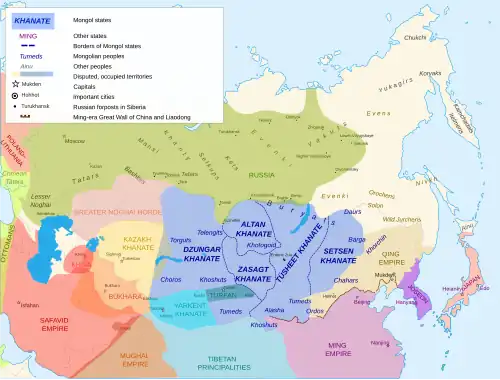 - ↑ Millward, James A. (2007), Eurasian crossroads: a history of Xinjiang, Columbia University Press, pp. 45–47, ISBN 978-0-231-13924-3, archived from the original on 10 April 2023, retrieved 20 June 2015