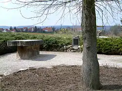 The central point shifted several times during the country's eventful history. Today Niederdorla in the state of Thuringia claims to be the most central municipality in Germany. A plaque was erected and a lime tree planted at 51°9′48.15″N 10°26′51.66″E / 51.1633750°N 10.4476833°E after the 1990 German reunification.[1] The point was confirmed as the centroid of the extreme coordinates by the Dresden University of Technology. Niederdorla also comprises the centre of gravity (equilibrium point) about 4.5 km (2.8 mi) to the southwest. Other municipalities competing are Krebeck in Lower Saxony and Edermünde in Hesse, as well as the village of Landstreit near Eisenach.