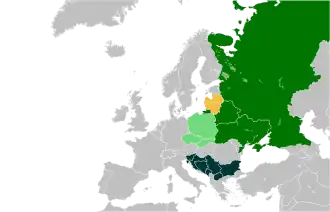 ![]() The pre-1989 Eastern Bloc and SFR Yugoslavia (orange) superimposed on 2005 European borders |