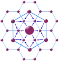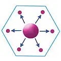 According to the marketing principle K = 3, the market area of a higher-order place (node) occupies one-third of the market area of each of the consecutive lower size place (node) that lies on its neighbour; the lower size nodes (6 in numbers and second larger circles) are located at the corner of a largest hexagon around low value the high-order settlement. Each high-order settlement gets one-third of each satellite settlement (which are 6 in total), thus K = 1 + 6 × 1⁄3 = 3.