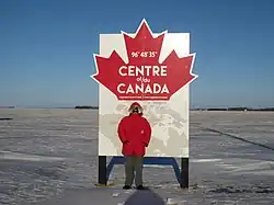 The Rural Municipality of Taché, Manitoba, east of Winnipeg on the Trans-Canada Highway, has a sign at 96°48'35"W that proclaims it the longitudinal centre of Canada.[1] The sign was upgraded with the opening of Centre of Canada Park in 2017.[2] In effect, it marks the north-south line midway between the extreme points of Canada on the east and west, including islands (including Newfoundland since 1949).