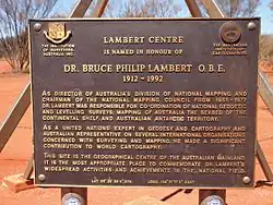 In 1988, the Royal Geographical Society of Australasia determined the geographical centre of Australia as a Bicentennial project. A monument was erected to mark the location and named in honour of Dr. Bruce Philip Lambert, a former director of the Division of National Mapping, for his achievements in the national survey, levelling and mapping of the continent.[6] The plaque contains an error, as Lambert died in 1990, not 1992. Similar to the centre-of-gravity method, the location was calculated from 24,500 points at the high-water mark of Australia's coastline.[7][8] The computed result of the 1988 project was 25 degrees 36 minutes 36.4 seconds south latitude, 134 degrees 21 minutes 17.3 seconds east longitude (25°36′36.4″S 134°21′17.3″E / 25.610111°S 134.354806°E); position on SG53-06 Finke 1:250 000 and 5746 Beddome 1:100 000 scale maps.[1][9]