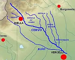 In the Vercellese plain, where the Canale Cavour crosses over the torrent, the Cervo is significantly enriched by the contribution of numerous minor water courses and canals. In the area of Collobiano it is joined by more important torrents: the Rovasenda and Marchiazza from the left and from the right the Elvo, its most important tributary.