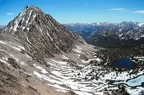 Chamberlain Basin is a drainage basin that contains a chain of ten alpine and glacial Paternoster lakes in Custer County, Idaho, United States, located in the White Cloud Mountains in the Sawtooth National Recreation Area. Lakes are located on the upper portion of Chamberlain Creek in the Germania Creek watershed, a tributary of the East Fork Salmon River. Castle Peak, the highest summit in the White Cloud Mountains, rises to the east and north of Chamberlain Basin. Sawtooth National Forest trail 047 crosses the basin, although most people begin their trips at the Fourth of July Creek trailhead.[2] Individual lakes do not have official names and are listed from lowest to highest elevation.