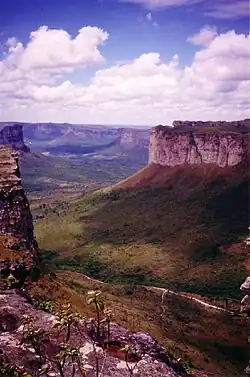 A chapada (Portuguese pronunciation: [ʃaˈpadɐ]) is a plateau found in the Brazilian Highlands. The chapadas, which are usually described as mountain ranges, are capped by horizontal strata of sandstone. They show the original surface, which has been worn away by the rivers, leaving here and there broad flat-topped ridges between river basins and narrower ranges of hills between river courses. From the valleys their rugged, deeply indented escarpments, stretching away to the horizon, they have the appearance of a continuous chain of mountains.[1]