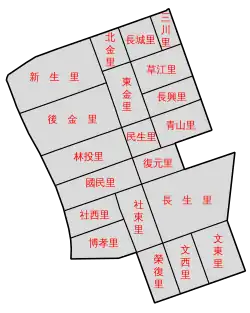 Cianjin District consists of 20 villages and 263 neighborhoods.[8] The villages in the district are Sanchuan, Caojiang, Zhangcheng, Beijin, Tungjin, Xinsheng, Houjin, Zhangxing, Jingshan, Minsheng, Fuyuan, Lintou, Guomin, Shetung, Shexi, Zhangsheng, Rongfu, Wenxi and Wentung Village.[9]