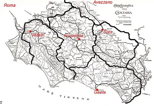 - ↑ The first work in which the entire province of Frosinone is defined as "Ciociarìa" is conventionally identified in a book edited by the Provincial Administration of Frosinone, published on the occasion of the thirtieth anniversary of the establishment of the province in 1957. The first, however, to connote as Ciociaria the borders of 1927 were instead the fascists: they adopted for the first time expressions as centers of Ciociaria for the municipalities of the province and Ciociara fascism for their political initiative. See: Squadrismo. 20 ottobre XVIII. Ventennale del Fascio di Frosinone, Federazione ciociara del P.N.F.