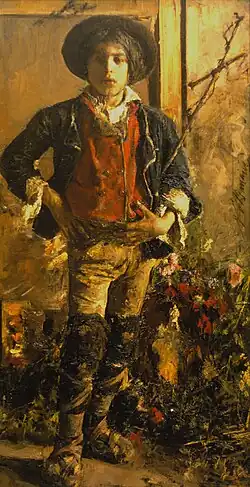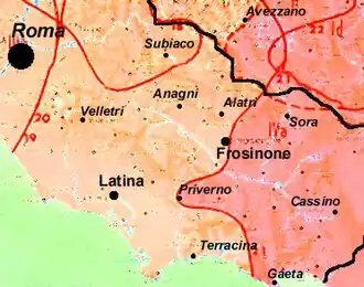 Ciociaria (Italian pronunciation: [tʃotʃaˈriːa]) is the name commonly used, in modern times, for some impoverished territories southeast of Rome, without defined geographical limits.[1][2][3][4] Starting from the Fascist period and the creation of the province of Frosinone, the same name was arbitrarily imposed by the local fascist organizations[5] and then misused by the local press, by promotional associations and folkloristic events as a synonym for Frosinone and all the popular traditions of its territory.[6][7] The local dialect is referred to as campanino in old literature.[8] It is merely a local variants of Central-Italian Latian but is improperly indicated as "ciociaro dialect", although the linguistic and scientific definition is Central-Northern Latian.[9] In more recent times, the term Campagna Romana, or Roman Campagna, a favorite subject of countless painters from all over Europe, has referred to the adjoining region to the north of Ciociaria, but part of the Province of Rome.