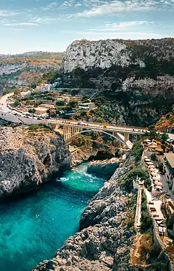 One of the main tourist attractions is Ponte del Ciolo (Ciolo's Bridge), the bridge that connects the two crags and from which it is possible to high dive.