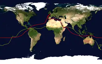 In yacht racing, a round-the-world route approximating a great circle would be quite impractical, particularly in a non-stop race where use of the Panama and Suez Canals would be impossible. Yacht racing therefore defines a world circumnavigation to be a passage of at least 21,600 nautical miles (40,000 km) in length which crosses the equator, crosses every meridian and finishes in the same port as it starts.[12] The second map on the right shows the route of the Vendée Globe round-the-world race in red; overlaid in yellow are the points antipodal to all points on the route. It can be seen that the route does not pass through any pairs of antipodal points. Since the winds in the higher southern latitudes predominantly blow west-to-east it can be seen that there are an easier route (west-to-east) and a harder route (east-to-west) when circumnavigating by sail; this difficulty is magnified for square-rig vessels due to the square rig's dramatic lack of upwind ability when compared to a more modern Bermuda rig.[11]