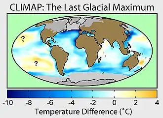 CLIMAP has been a cornerstone of paleoclimate research and remains the most used sea surface temperature reconstruction of the global ocean during the last glacial maximum (Yin and Battisti 2001), but it has also been persistently controversial. CLIMAP resulted in estimates of global cooling of only 3.0 ± 0.6 °C relative to the modern day (Hoffert and Covey 1992). The climate change during an ice age that occurs far from the continental ice sheets themselves is believed to be primarily controlled by changes in greenhouse gases, hence the conditions during the last glacial maximum provide a natural experiment for measuring the impact of changes in greenhouse gases on climate. The cited estimates of 3.0 °C implies a climate sensitivity to carbon dioxide changes at the low end of the range proposed by the Intergovernmental Panel on Climate Change.[1]