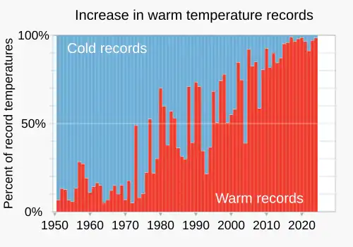 In recent decades, new high temperature records have substantially outpaced new low temperature records on a growing portion of Earth's surface.[51]