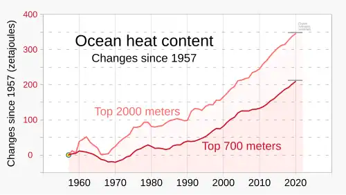 There has been an increase in ocean heat content during recent decades as the oceans absorb over 90% of the heat from global warming.[52]