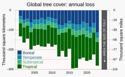The rate of global tree cover loss has approximately doubled since 2001, to an annual loss approaching an area the size of Italy.[127]