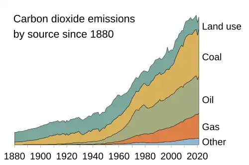 Present-day climate change includes both global warming—the ongoing increase in global average temperature—and its wider effects on Earth’s climate system. Climate change in a broader sense also includes previous long-term changes to Earth's climate. The current rise in global temperatures is driven by human activities, especially fossil fuel burning since the Industrial Revolution.[3][4] Fossil fuel use, deforestation, and some agricultural and industrial practices release greenhouse gases.[5] These gases absorb some of the heat that the Earth radiates after it warms from sunlight, warming the lower atmosphere. Carbon dioxide, the primary gas driving global warming, has increased in concentration by about 50% since the pre-industrial era to levels not seen for millions of years.[6]