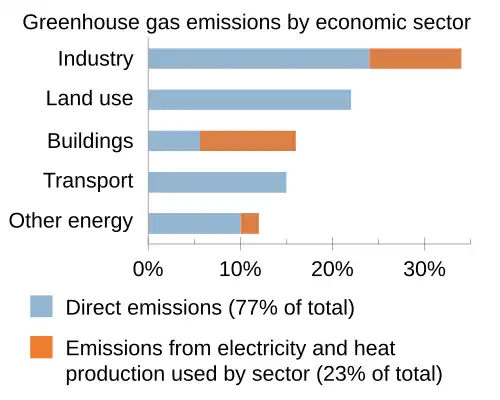 Around 30% of Earth's land area is largely unusable for humans (glaciers, deserts, etc.), 26% is forests, 10% is shrubland and 34% is agricultural land.[128] Deforestation is the main land use change contributor to global warming,[129] as the destroyed trees release CO2, and are not replaced by new trees, removing that carbon sink.[130] Between 2001 and 2018, 27% of deforestation was from permanent clearing to enable agricultural expansion for crops and livestock. Another 24% has been lost to temporary clearing under the shifting cultivation agricultural systems. 26% was due to logging for wood and derived products, and wildfires have accounted for the remaining 23%.[131] Some forests have not been fully cleared, but were already degraded by these impacts. Restoring these forests also recovers their potential as a carbon sink.[132]