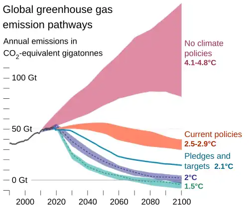 The IPCC Sixth Assessment Report (2021) included projections that by 2100 global warming is very likely to reach 1.0–1.8 °C under a scenario with very low emissions of greenhouse gases, 2.1–3.5 °C under an intermediate emissions scenario, or 3.3–5.7 °C under a very high emissions scenario.[92] The warming will continue past 2100 in the intermediate and high emission scenarios,[93][94] with future projections of global surface temperatures by year 2300 being similar to millions of years ago.[95]
