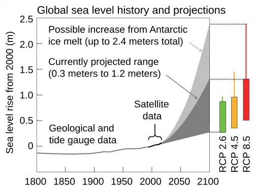 Global sea level is rising as a consequence of thermal expansion and the melting of glaciers and ice sheets. Sea level rise has increased over time, reaching 4.8 cm per decade between 2014 and 2023.[197] Over the 21st century, the IPCC projects 32–62 cm of sea level rise under a low emission scenario, 44–76 cm under an intermediate one and 65–101 cm under a very high emission scenario.[198] Marine ice sheet instability processes in Antarctica may add substantially to these values,[199] including the possibility of a 2-meter sea level rise by 2100 under high emissions.[200]