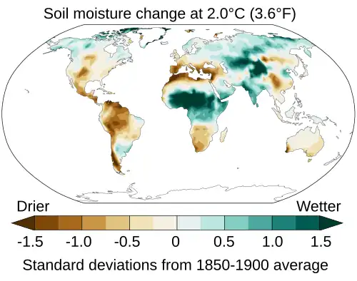 The sixth IPCC Assessment Report projects changes in average soil moisture at 2.0 °C of warming, as measured in standard deviations from the 1850 to 1900 baseline.