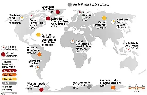Different levels of global warming may cause different parts of Earth's climate system to reach tipping points that cause transitions to different states.[206][207]