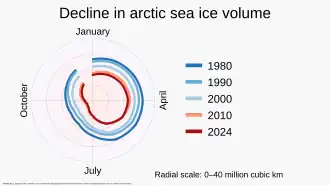 Sea ice in the Arctic region has declined in recent decades in area and volume due to climate change. It has been melting more in summer than it refreezes in winter. Global warming, caused by greenhouse gas forcing is responsible for the decline in Arctic sea ice. The decline of sea ice in the Arctic has been accelerating during the early twenty-first century, with a decline rate of 4.7% per decade (it has declined over 50% since the first satellite records).[49][50][51] Summertime sea ice will likely cease to exist sometime during the 21st century.[52]