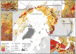- ↑ Ramage, Justine; Jungsberg, Leneisja; Wang, Shinan; Westermann, Sebastian; Lantuit, Hugues; Heleniak, Timothy (6 January 2021). "Population living on permafrost in the Arctic". Population and Environment. 43 (1): 22–38. Bibcode:2021PopEn..43...22R. doi:10.1007/s11111-020-00370-6. S2CID 254938760.