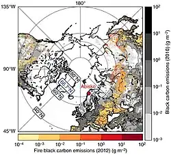 Black carbon deposits (from the combustion of heavy fuel oil (HFO) of Arctic shipping) absorb solar radiation in the atmosphere and strongly reduce the albedo when deposited on snow and ice, thus accelerating the effect of the melting of snow and sea ice.[122] A 2013 study quantified that gas flaring at petroleum extraction sites contributed over 40% of the black carbon deposited in the Arctic.[123][124] 2019 research attributed the majority (56%) of Arctic surface black carbon to emissions from Russia, followed by European emissions, and Asia also being a large source.[125][122] In 2015, research suggested that reducing black carbon emissions and short-lived greenhouse gases by roughly 60 percent by 2050 could cool the Arctic up to 0.2 °C.[126] However, a 2019 study indicates that "Black carbon emissions will continuously rise due to increased shipping activities", specifically fishing vessels.[127]