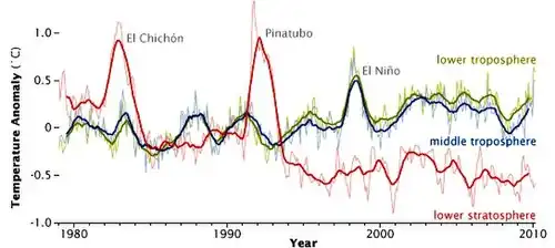 - 1 2 Hawkins, Ed (12 September 2019). "Atmospheric temperature trends". Climate Lab Book. Archived from the original on 12 September 2019. (Higher-altitude cooling differences attributed to ozone depletion and greenhouse gas increases; spikes occurred with volcanic eruptions of 1982–83 (El Chichón) and 1991–92 (Pinatubo).)