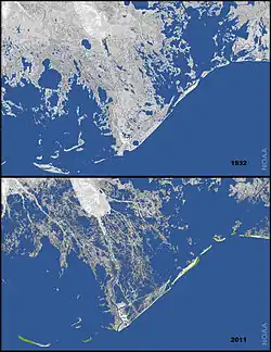 Coastal erosion in Louisiana is the process of steady depletion of wetlands along the state's coastline in marshes, swamps, and barrier islands, particularly affecting the alluvial basin surrounding the mouth of the Mississippi River. In the last century, coastal Louisiana has lost an estimated 4,833 square kilometers (1,866 sq mi) of land, approximately the size of Delaware's land area.[1] Coast wide rates of wetland change have varied from −83.5 square kilometers (−32.2 sq mi) to −28.01 square kilometers (−10.81 sq mi) annually, with peak loss rates occurring during the 1970's.[1] One consequence of coastal erosion is an increased vulnerability to hurricane storm surges, which affects the New Orleans metropolitan area and other communities in the region. The state has outlined a comprehensive master plan for coastal restoration and has begun to implement various restoration projects such as fresh water diversions, but certain zones will have to be prioritized and targeted for restoration efforts, as it is unlikely that all depleted wetlands can be rehabilitated.