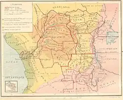 Congo-Kasaï was named after the Kasai River, a major left tributary of the Congo River that provides access to the region. By 1910 a factory of the Kasai Company had been established near Misumba, which had about two thousand inhabitants.[1] The company had made successful trial rubber plantations.[2] The company also bought rubber and ivory from the local people, some of whom used it to buy liquor from the Portuguese territory (Angola).[3]