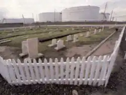 The Van Buskirk farmhouse was demolished in 1906 by the Standard Oil Company, which owned the land and were expanding their refinery. Standard Oil has now refurbished the cemetery.[8] On July 4, 1900, a fire broke out in the Standard Oil refinery. It started when lightning caused a number of the large oil tanks to explode. Flaming oil spread out into New York Bay. It took three days to extinguish the fire that in the end caused $2.5 million in damages yet only nine injuries.
