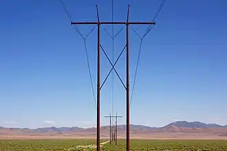 ![]() HVAC transmission towers cross Crescent Valley eastward toward the Cortez Mountains in the distance | |