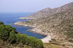 The coast was named Costa Brava by Ferran Agulló i Vidal in an article published in the Catalan newspaper La Veu de Catalunya in September 1908. Agulló, a journalist born in Girona, referred to the rugged landscape of the Mediterranean coast which runs from the River Tordera, near Blanes, to Banyuls with the name Costa Brava.[1][2] Costa is the Catalan and Spanish word for 'coast', while Brava in both languages means 'rugged' or 'wild'.[3] This term was officially recognized and promoted in the 1960s as it was deemed suitable to promote tourism in the region.[4] Before Costa Brava became the official name, other names were suggested, such as Costa Grega (Greek Coast), Costa del Corall (Coral Coast), Costa Serena (Serene Coast), Costes de Llevant (Levant Coasts) or Marina de l'Empordà (Empordà Marine).[5]
