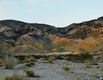 During the Miocene, around 22-14 million years ago, volcanic activity produced various volcanic rock features including basalt flows, an andesite plug, and various volcaniclastics including tuffs and breccias, known as the Alverson Formation.[8] These volcanic rocks are primarily exposed along the east and southeastern portion of the range, and are best viewed and easily accessed in the Painted Gorge area of the range (where multiple volcanic rock types of varying colors are exhibited, giving the area a gorgeous 'painted' appearance).[9][10]
