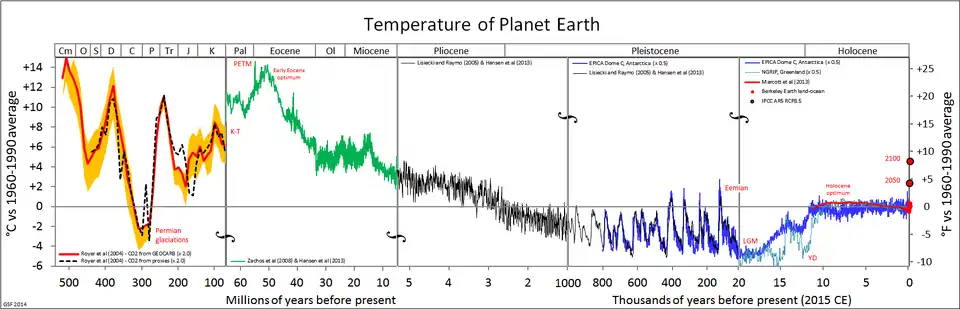 - ↑ Scotese, Christopher R.; Song, Haijun; Mills, Benjamin J. W.; Van der Meer, Douwe G. (April 2021). "Phanerozoic paleotemperatures: The earth's changing climate during the last 540 million years". Earth-Science Reviews. 215: 103503. Bibcode:2021ESRv..21503503S. doi:10.1016/j.earscirev.2021.103503. S2CID 233579194. Retrieved 17 March 2023.