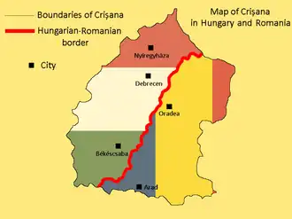 Crișana (Romanian: Crișana, Hungarian: Körösvidék, German: Kreischgebiet) is a geographical and historical region in north-western Romania, named after the Criș (Körös) River and its three tributaries: the Crișul Alb, Crișul Negru, and Crișul Repede. In Romania, the term is sometimes extended to include areas beyond the border, in Hungary; in this interpretation, the region is bounded to the east by the Apuseni Mountains, to the south by the Mureș River, to the north by the Someș River, and to the west by the Tisza River, the Romanian-Hungarian border cutting it in two.[1][2] However, in Hungary, the area between the Tisza River and the Romanian border is usually known as Tiszántúl.