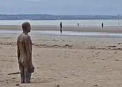 The Another Place sculptures by Antony Gormley are found here and, after a Sefton Council meeting on 7 March 2007, it has been allowed to stay permanently.[14] Gormley's reason for choosing Crosby Beach as the location was that he thought of the beach as being "the opposite of pretty. It is terrific and brutal and is a working beach".[15] The sculptures were painted in June 2017 in what was described as vandalism, although several residents reacted favourably to the graffiti.[16]