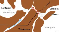 The Cumberland Gap is one of many passes in the Appalachian Mountains, but one of the few in the continuous Cumberland Mountain ridgeline.[2] It lies within Cumberland Gap National Historical Park and is located on the border of present-day Kentucky and Virginia, approximately 0.25 miles (0.40 km) northeast of the tri-state marker with Tennessee.[3]