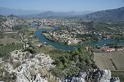 Above the river's sheer cliffs are the weathered façades of Lycian tombs cut from rock, circa 400 BC (36°50′1.09″N 28°38′3.16″E / 36.8336361°N 28.6342111°E). The ruins of the ancient trading city of Kaunos are a short boat trip across the river.[8]
