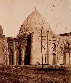 On an eminence in the western part of the city are the ruins of a large square citadel with a small whitewashed building, called Molud Khaneh ('the house of birth'), in which Fath-Ali Shah Qajar was born (1772).[11] Beside these, Damghan is close to the Gonbade Zangol, Toghrol's Tower, Qoosheh Amirabad Caravansary (a building from the time of Abbas the Great), historical hills and hazel-shaped castles around the city as well as Gerdkuh and Masoumzadeh Mehmandoust fortifications. Damghan's bazaar contains tombs, old schools, baths and the like. Historical monuments in Damghan have interested foreign archaeologists and many items excavated there are now in British and French museums.