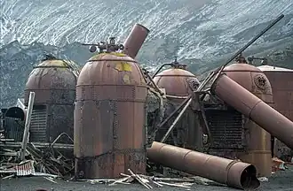 The development of pelagic whaling in the 1920s, where factory ships fitted with a slipway could tow aboard entire whales for processing, meant that whaling companies were no longer tied to sheltered anchorages. A boom in pelagic Antarctic whaling followed, with companies now free to ignore quotas and escape the costs of licences. This rapidly led to overproduction of oil and a collapse in the market, and the less profitable and more heavily regulated shore-based companies had trouble competing. In early 1931, the Hektor factory finally ceased operation, ending commercial whaling at the island entirely.[11]