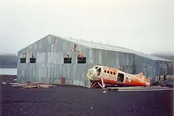 Remains of previous structures at Whalers Bay include rusting boilers and tanks, an aircraft hangar, and the British scientific station house (Biscoe House), with the middle torn out by the 1969 mudflows. A bright orange derelict airplane fuselage, which is that of a de Havilland Canada DHC-3 Otter that belonged to the Royal Air Force, was recovered in 2004. Plans to restore the airplane and return it to the island have been made.[27]