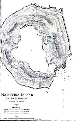 In 1829, the British Naval Expedition to the South Atlantic under the command of Captain Henry Foster in HMS Chanticleer stopped at Deception. The expedition conducted a topographic survey and scientific experiments, particularly pendulum and magnetic observations.[16] A watercolour made by Lieutenant Kendall of the Chanticleer during the visit may be the first image made of the island.[11] A subsequent visit by the American elephant-sealer Ohio in 1842 reported the first recorded volcanic activity, with the southern shore "in flames".[11]