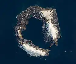 Deception Island is in the South Shetland Islands close to the Antarctic Peninsula with a large and usually "safe" natural harbour, which is occasionally affected by the underlying active volcano.[1] This island is the caldera of an active volcano, which seriously damaged local scientific stations in 1967 and 1969. The island previously held a whaling station. It is now a tourist destination with over 15,000 visitors per year. Two research stations are operated by Argentina and Spain during the summer season.[2] While various countries have asserted sovereignty, it is still administered under the Antarctic Treaty System, meaning it is under no control.