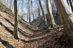 The word "dell" comes from the Old English word dell, which is related to the Old English word dæl, modern 'dale'.[2][3] The term is sometimes used interchangeably with the word "dingle", although "dingle" specifically refers to deep ravines or hollows that are embowered with trees.[4] The terms have also been combined to form examples of tautological placenames in Dingle Dell, Kent, and Dingle Dell Reserve, Auckland.[5][6]