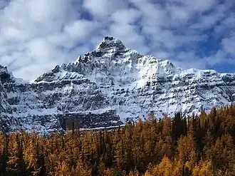 Deltaform Mountain is one of the mountains in the Valley of the Ten Peaks, located on the Continental Divide on the border of British Columbia and Alberta, and also on the border between Banff and Kootenay National Parks in Canada. The mountain was originally named Saknowa by Samuel Allen but Walter Wilcox named it to its official title in 1897 as it resembles the Greek letter delta.[1][4]