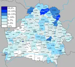 The Poles were the fourth largest ethnic group in Byelorussian SSR (current Eastern portion of Belarus), before World War II, comprising 1–2% of the population in the pre-war censuses (less than 100,000).[17]